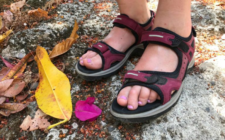 Although I wore my Keen closed-toe sandals on off-path hikes through water and slippery rocks, I chose the Ecco Yucatan for our many path hikes and casual walks through town. With temperatures in the 90s and high humidity, an open-toe sport sandal allowed for better air circulation around my tired feet. While the upper straps are nubuck, they’re lined with soft Lycra® spandex and nylon for a soft feel that wicks moisture.